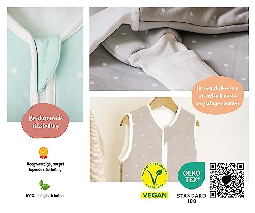 Veilig en geborgen. De babyslaapzak met pijpjes is gemaakt van zacht biologisch katoen (GOTS-gecertificeerd). Alle andere componenten zijn Oeko-Tex gecertificeerd.