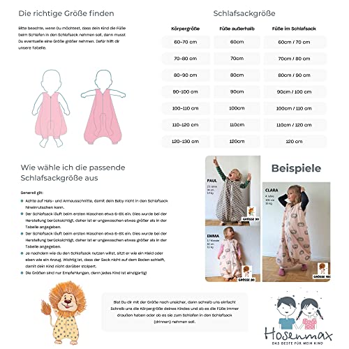 Specificaties: Hosenmax® Babyslaapzak met benen – biologisch katoen – komt overeen met TOG 2.5 – slaapzak voor het hele jaar door maat 56/58 tot 120 cm (brute aap, 110 cm)