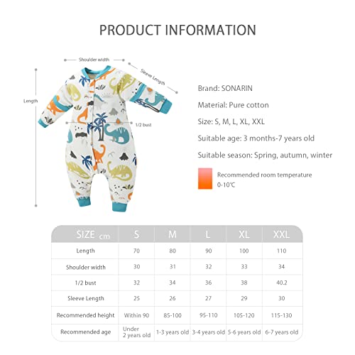 Specificaties: SONARIN Babyslaapzak met poten en afneembare mouwen, zachte katoenen babydeken anti-kick winterslaapzak voor peuters en kinderen, verschillende maten van 3 maanden tot 7 jaar oud, Dinosaurus, XL