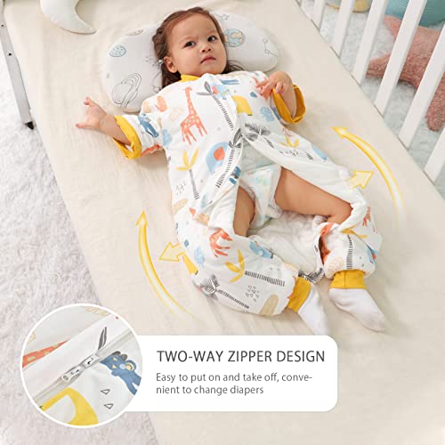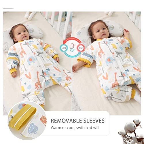 Gespleten benen en afneembare mouwen: Gespleten benen ontwerp geeft je baby meer vrijheid over benen. De twee lange mouwen kunnen met ritssluiting worden verwijderd, zodat de temperatuur vrij kan aanpassen en oververhitting van de baby kan voorkomen. U kunt beslissen of de baby mouwen nodig heeft op basis van de binnentemperatuur.