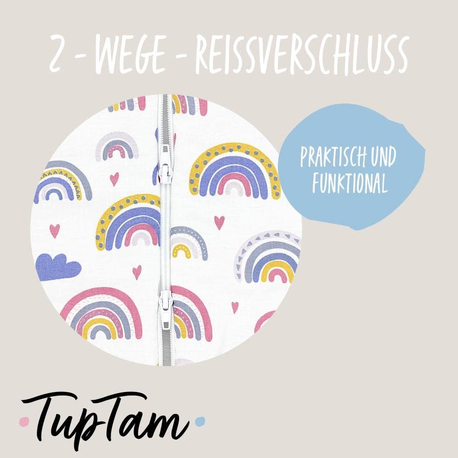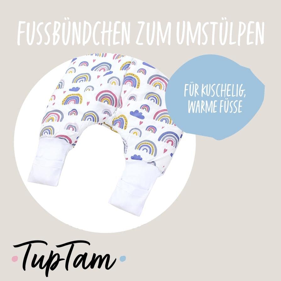 De kindermotieven met dieren of regenbogen maken de babyslaapzakken van TupTam tot echte blikvangers! Deze winterslaapzakken scoren niet alleen met hun schattige ontwerpen, maar zijn ook erg praktisch. Het grote pluspunt is de tweewegrits met de kinbeschermer, die het inbakeren heel gemakkelijk maakt. Omdat de mouwen via de drukknoopsluiting kunnen worden verwijderd, kan het ook in het voor- of najaar worden gebruikt. De elastische manchetten kunnen worden omgeslagen. U kunt ze dus op koude nachten binnenstebuiten keren en overdag open laten. Het zachte katoenmateriaal met de voering van ademend polyester zorgt voor een uitstekend slaapgevoel.