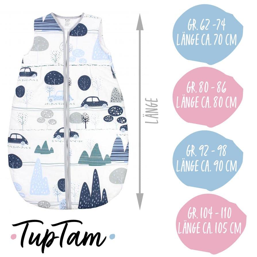 Deze prachtige kinderslaapzak van TupTam zorgt voor een gezonde en veilige slaap voor baby en peuter. De buitenstof van zuiver, ademend katoen en de zachte vulling van anti-allergisch polyestervlies garanderen een zeer goed ademend vermogen en een optimaal slaapklimaat. De klassieke peervorm biedt de baby veel bewegingsvrijheid. Er is een keuze uit mooie motieven en heldere, frisse kleuren om de kleintjes te plezieren. Aan de voorzijde is de slaapzak voor het hele seizoen van boven naar beneden geopend met een comfortabele rits, die bovendien is voorzien van een kinbescherming. Deze babyslaapzak wordt aanbevolen voor gebruik het hele jaar door en bij kamertemperaturen van ongeveer 17-22 graden. Afhankelijk van het seizoen moet u de slaapkleding van uw kind aanpassen. In de herfst en winter moet u bijvoorbeeld een pyjama met lange mouwen of een lichaam met lange mouwen aantrekken voor uw baby. Op warme dagen is het beter om een pyjama met korte mouwen of korte mouwen te dragen. Controleer altijd of uw kind het te warm of te koud heeft. Warme voeten en een warme, droge nek zijn tekenen dat alles past. Gemaakt in de EU.