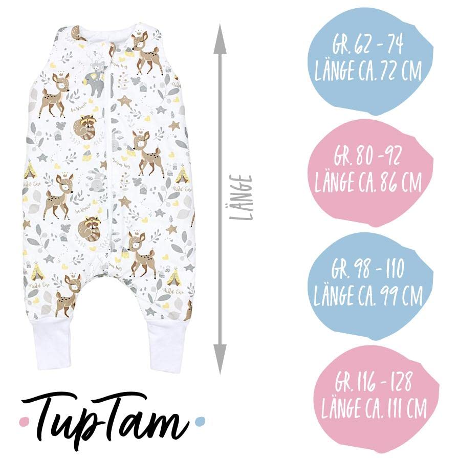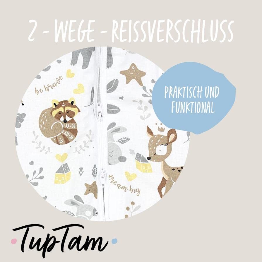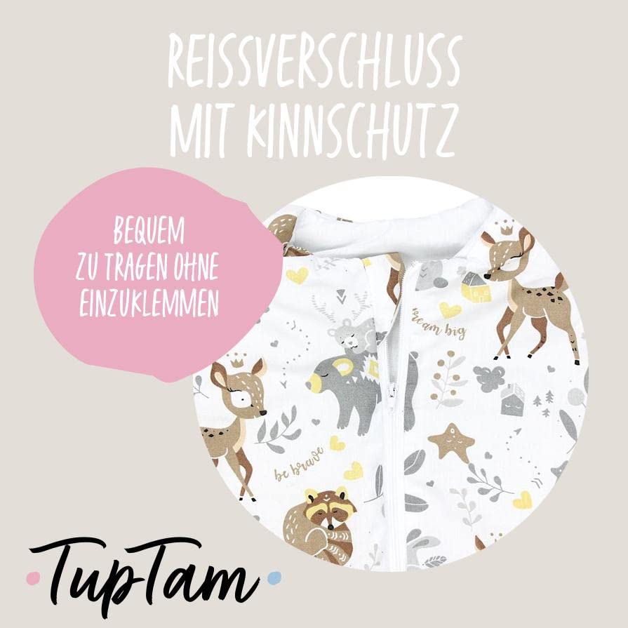 Deze babyslaapzak van TupTam omhult je kleintje gezellig en warm op koude dagen. De zachte en ademende katoenen stof geleidt de warmte zodat uw baby niet zweet en veilig slaapt. Bovendien zorgen de zachte vulling en de TOG-waarde van 2,5 voor een aangename warmte in de winter. Dankzij de losse, wijde snit met rekbare beenboorden heeft het kind maximale bewegingsvrijheid bij het spelen en kruipen. Een ander voordeel van de slaapzak is de tweewegritssluiting met kinbeschermer, waardoor de baby snel en gemakkelijk kan worden verschoond. In prachtige motieven voor meisjes en jongens: Olifanten, dromenvangers, dieren of sterren. Gemaakt in de EU.