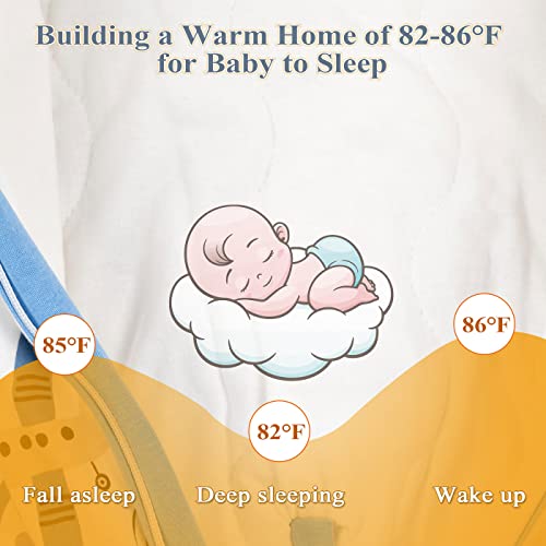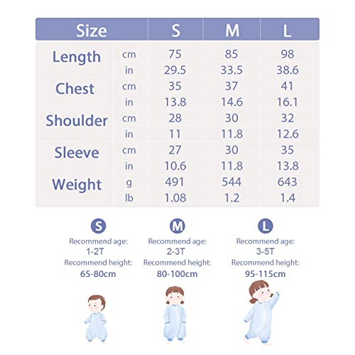 Houdt altijd warm: 2,5 TOG Slaapzak voor baby, geschikt voor lente, herfst en winter, temperaturen 16-20 ℃/32-48 ° F. Nadat de kleding is gewassen, zullen de zachte polyestervezels die als vullingen worden gebruikt, niet samenklonteren of naar andere delen verhuizen, houdt het lichaam altijd warm. En de broek en manchetten worden verlengd om koude lucht te blokkeren.